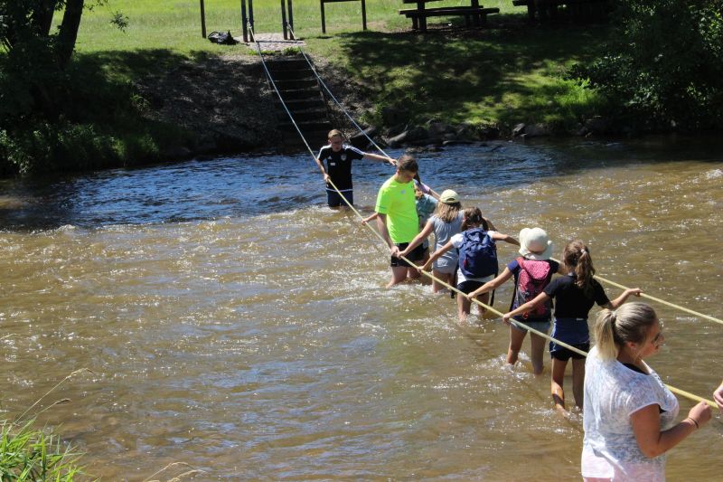 Weiter ging es über Feldwege und zahlreiche Hindernisse zum nächsten Highlight, die Nahe-Durchquerung. Anschließend liefen die Kinder über Rindenmulch, Kieselsteine und Korken zur nächsten Rast. Danach konnte ein kurzes abkühlendes Bad in der Nahe genommen werden, bevor wir zum Endspurt kamen. Über Seile, drehende Baumstämme und Wackelbrücken ging es dem Ende des Parcours zu.