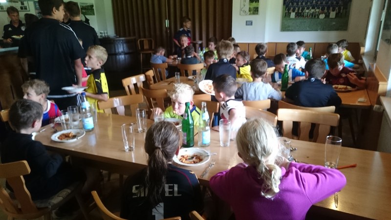 Nach kurzer Begrüßung der Eltern und Nachwuchskicker wurden alle Teilnehmer einheitlich mit Trainingsshirts, gesponsort von der Firma Holzbau Tülp, ausgestattet. So starteten wir gegen 10 Uhr mit verschiedenen altersgemäßen Spielformen in Kleingruppen, bei denen sich die Kinder kennenlernen konnten. Für die Mittagspause zauberte JSG-Schriftführer Elmar Schleicher in der Küche Nudeln mit Soße für den Fußballnachwuchs.