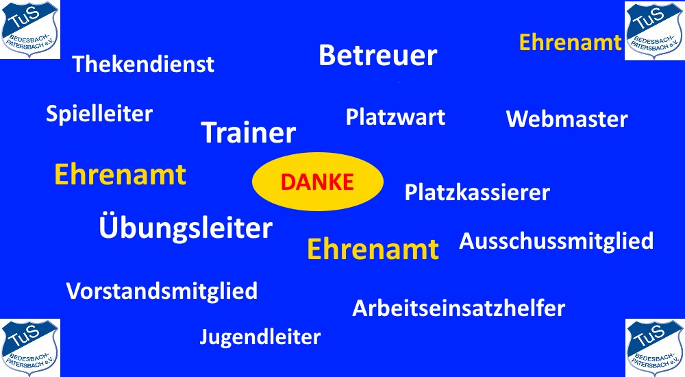 Der 05. Dezember ist "Tag des Ehrenamtes". Daher möchten wir an dieser Stelle allen DANKE sagen, die durch ihr unermüdliches Engagement in ihrer Freizeit unseren ► TuS Bedesbach/Patersbach und unsere in verschiedensten Funktionen und Tätigkeiten das ganze Jahr über am Laufen halten.