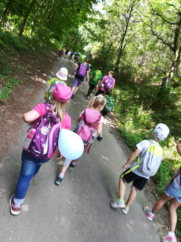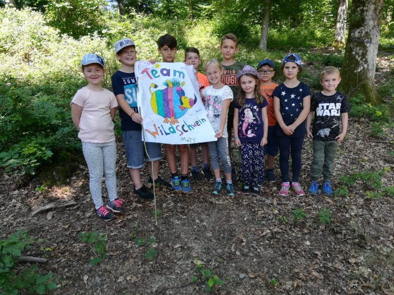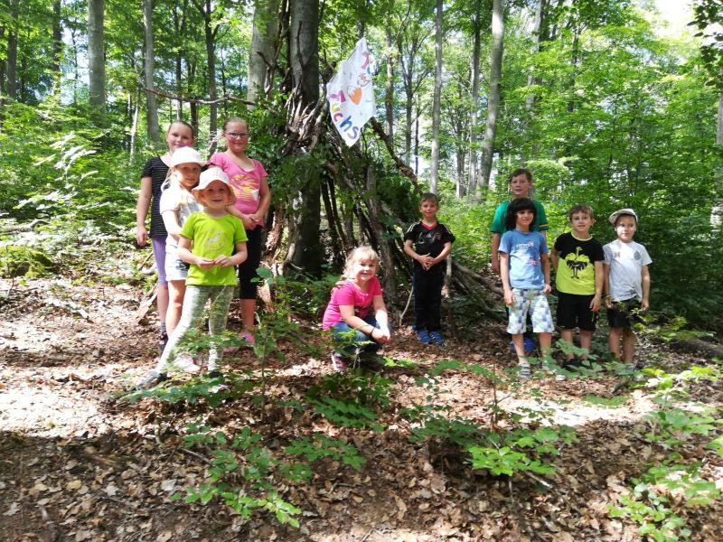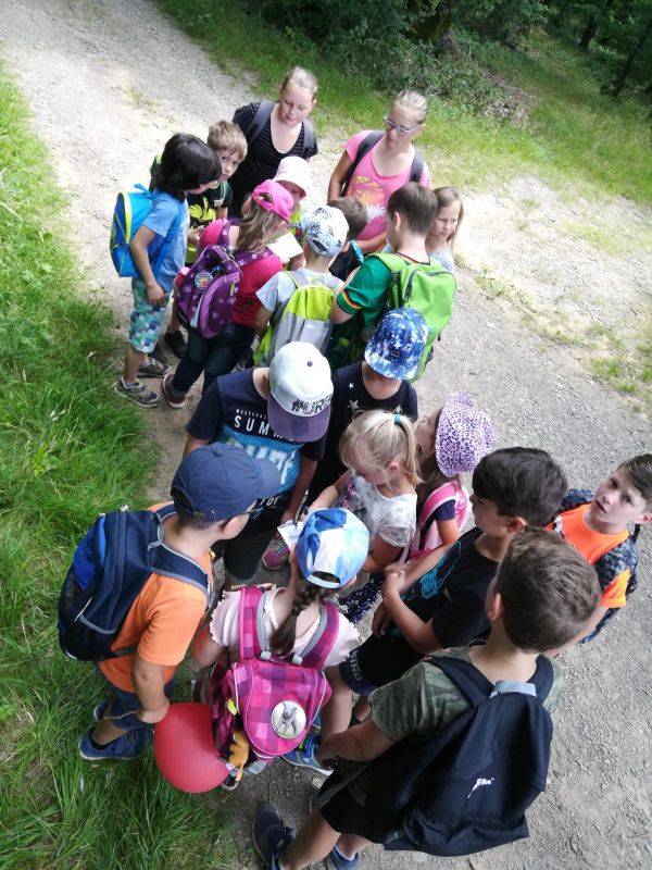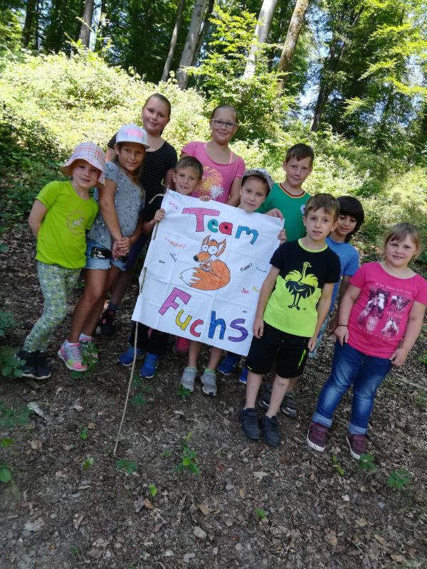 Am 26.6.2018 startete der Walderlebnistag mit einem Kennenlernspiel am Roten Platz in Patersbach. Danach teilten wir die 20 Kinder in zwei Gruppen ein: Team Wildschwein und Team Fuchs.
