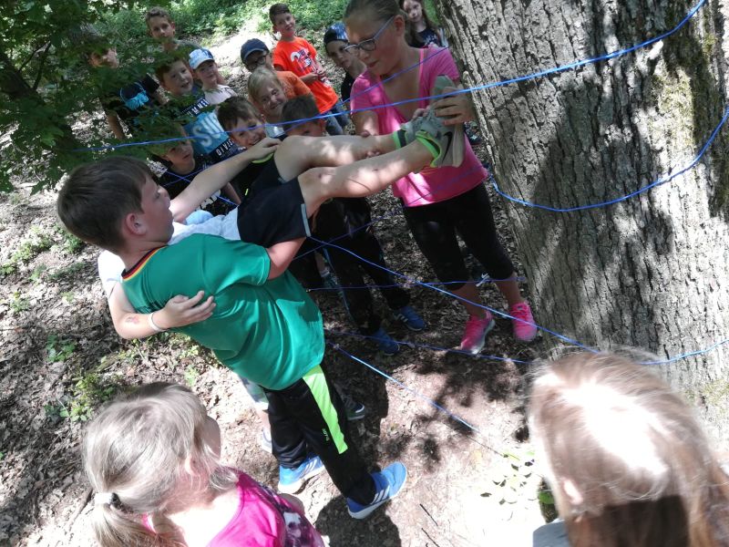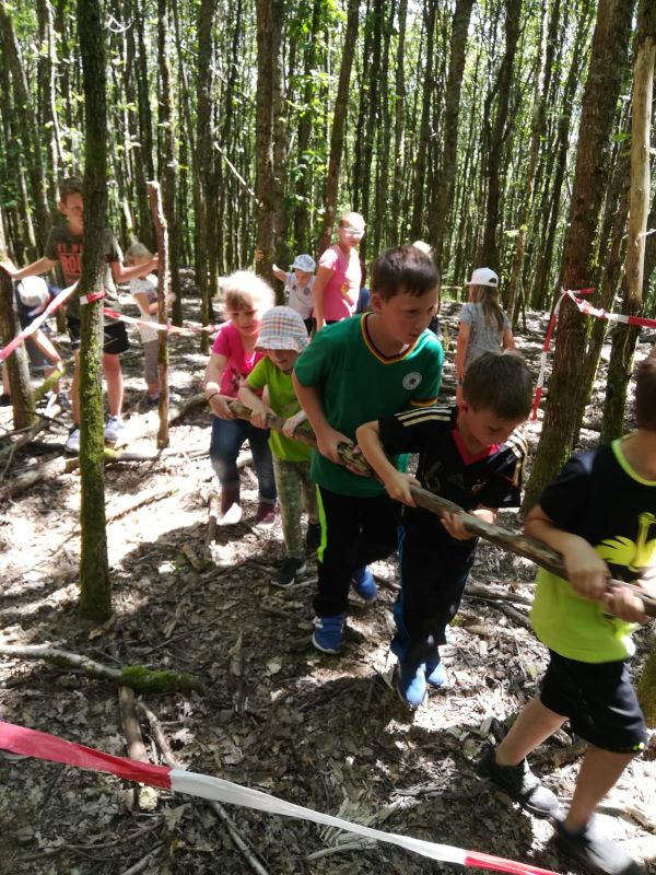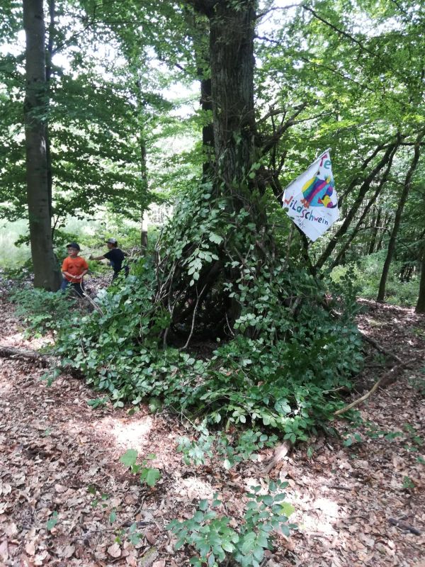 Weiter ging das Programm mit dem Baumscheibenspiel, es durften nur die vorhanden Baumscheiben benutz werden um den vorgegebenen Weg mit allen Gruppenmitgliedern zu absolvieren, hier war die Teamfähigkeit gefragt. Danach ging es zu einem bereits aufgebauten Labyrinth, indem die Gruppen einen Ast, durch führen mussten, ohne die Begrenzungen zu berühren. Nach diesem Spiel war das Tannenzapfenwerfen dran, bei dem die Kinder Tannenzapfen in verschieden weit entfernte Eimer werfen mussten. Die darauffolgende Trink- und Entspannungspause nutzen die Kinder zum eigenständigen spielen. Als nächstes wurde das Spinnennetz gespielt. Hier wurde jedes Team auf eine Probe gestellt. Denn ohne 100% Zusammenarbeit konnte man dieses Spiel nicht bewältigen. Es folgte der Frisbee –Parcours, hier musste man Frisbees an Bäume oder durch von uns aufgebaute Ziele werfen. Nun ging es zum längsten andauernd Spiel des Tages. Die Teams mussten sich innerhalb von 45 Minuten eine Hütte mit Materialien aus dem Wald bauen. Als diese Hütten fertig waren, wurde ein Versteck für ein Ei, innerhalb der Hütte gesucht und darin versteckt. Nun galt es als erstes die Hütte und das Ei zu verteidigen, aber auch dem Gegner gleichzeitig sein Ei zu stehlen. Beide Teams verteidigten ihre Verstecke so gut, dass wir dieses Spiel unterbrechen mussten, da die gegrillten Würstchen fertig waren. Nachdem wir gegessen und das Spiel beendet hatten, stand es Unentschieden zwischen den Teams. Also entschieden wir auf dem Rückweg noch ein Entscheidungsspiel zu spielen: das Schneckenrennen. Hier mussten die Kids so schnell wie möglich von A nach B kommen, indem sie unter den Beinen der Teamkameraden durchkriechen. Dieses Spiel gewannen, knapp die Wildschweine. So standen die Gewinner des Tages fest: Team Wildschwein. Zum Abschluss gab es am Roten Platz für jeden Teilnehmer noch eine Urkunde und ein Wassereis. Ein Kompliment noch an die Kinder, die ohne zu murren den langen „Auf-und Abstieg“ bewältigten.