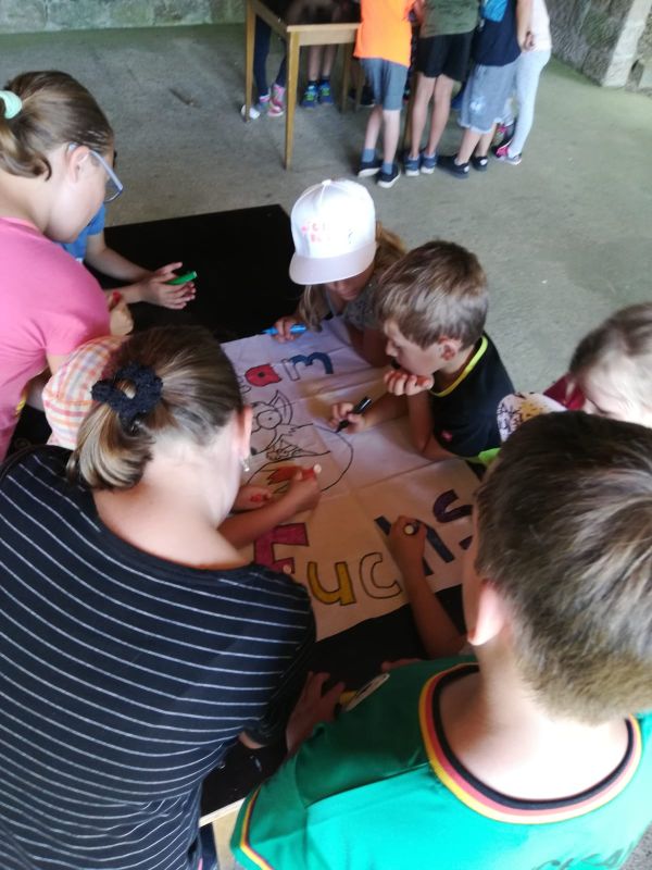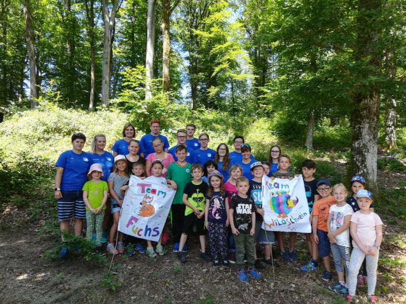 Im Anschluss startete der eineinhalbstündige Marsch zur Patersbacher Hütte, auf der Route machten die Kids, in ihren eingeteilten Teams, ein Quiz rund um den Wald. Nach den ersten vier Stationen mit Getränken und Quizfragen, spielten wir auf einer großen Wiese das Wäscheklammernspiel, bei dem alle Kinder mit viel Freude mitspielten. Auf den letzten Metern zum Ziel, gab es nochmal eine Quizfrage und ein Suchspiel. An der Hütte angekommen gab es erst mal eine Stärkung in Form von Brezeln, Muffins und Getränken. Gestärkt malten die Gruppen jeweils ihre Team Flagge.