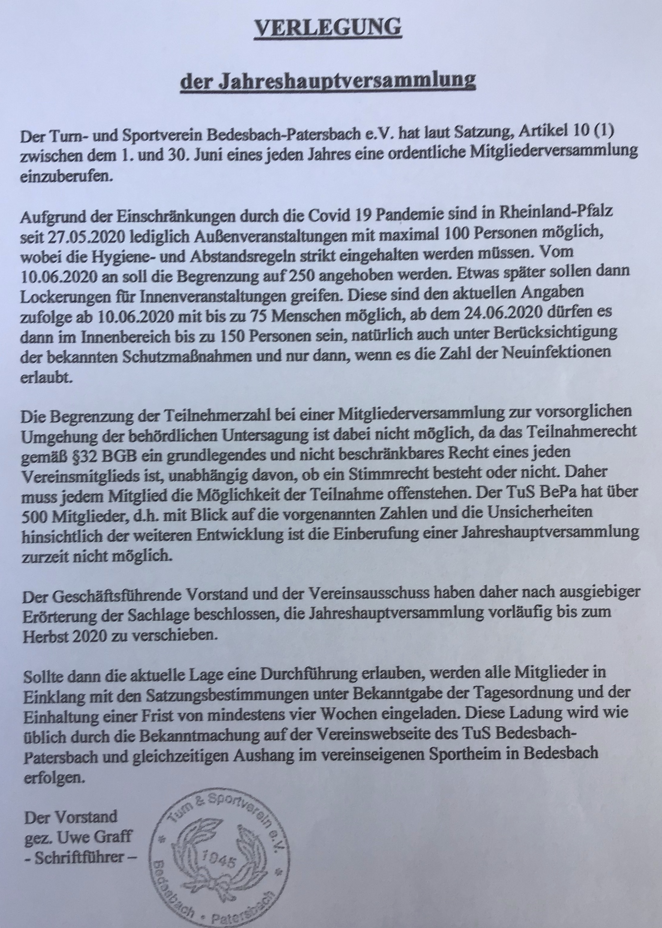 Wegen der aktuellen Situation und den daraus resultierenden Beschränkungen und Bestimmungen wird die für Juni geplante Jahreshauptversammlung des TuS Bedesbach-Patersbach verschoben. Weitere Informationen hier: