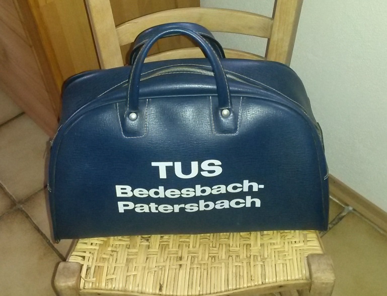 Es handelt sich hierbei um eine sehr gut erhaltene und gepflegte Sporttasche mit "TuS"-Aufdruck von Elkes Vater Lothar Hoffmann. Es ist nicht genau bekannt, wie alt die Tasche ist, aber 40 Jahre sollen es wohl schon mindestens sein.